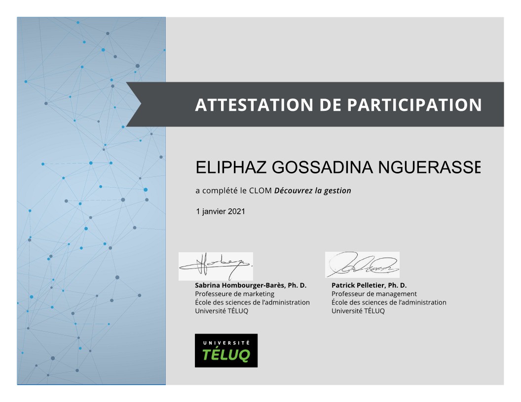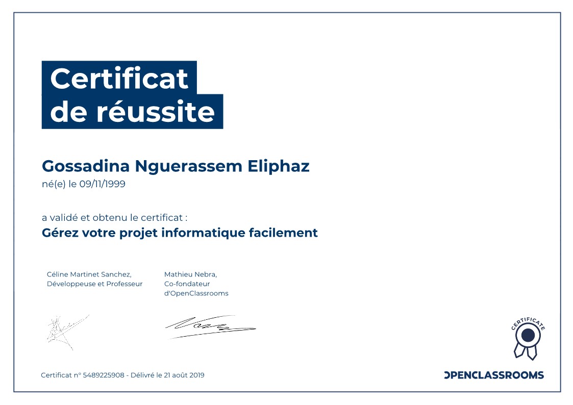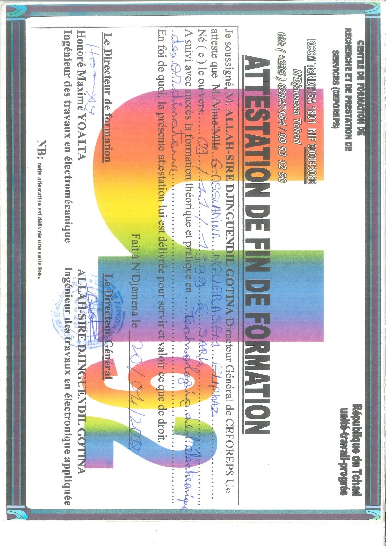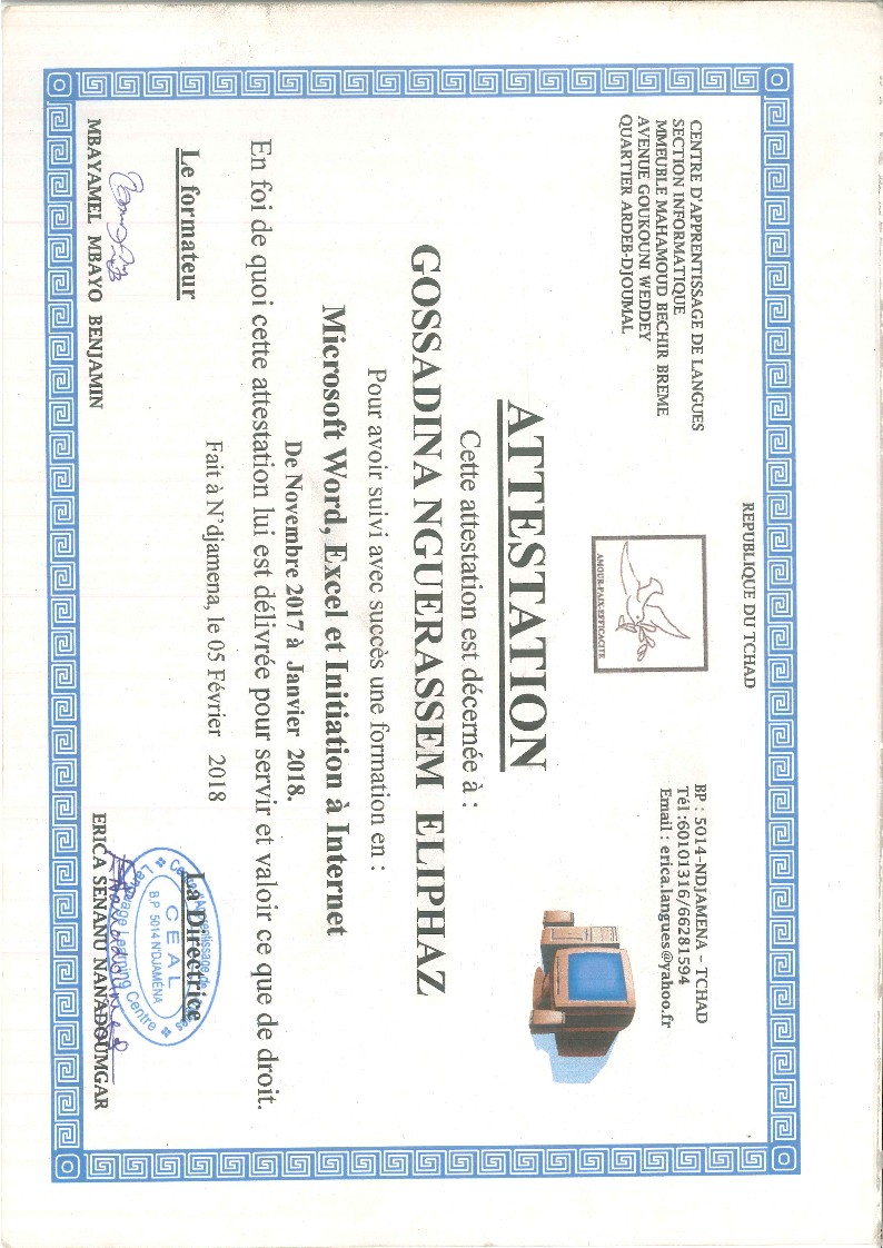 Je suis GOSSADINA NGUERASSEM Eliphaz, de nationalité tchadienne. Ingéneur en Informatique, obtenu à l'Université Catholique d'Afrique Centrale (UCAC) sous franchise de l'Institut Catholique d'Arts et de Metiers (ICAM) France. Je suis très passionné des nouvelles technologies avec plusieurs compétences acquises dans ce domaine.